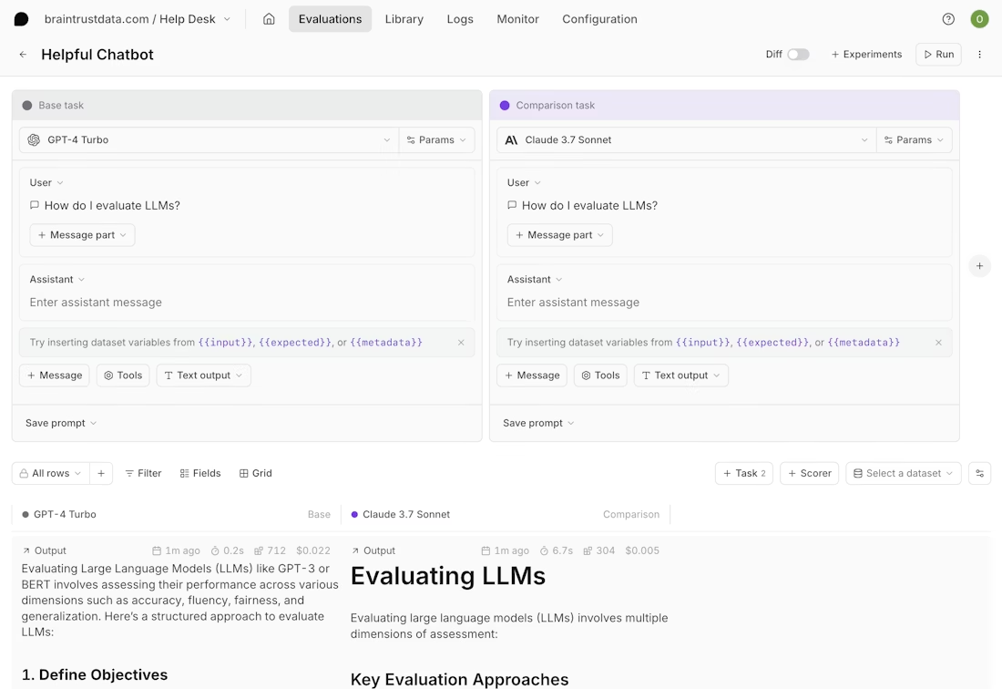 Once the failing step is identified, the trace can be loaded into Braintrust's Playground and re-run against the exact production inputs, tool calls, intermediate steps, and model configuration that triggered the failure. Unlike generic prompt tools that test prompts in isolation, the Playground preserves full execution context, so changes to prompts, parameters, routing logic, or tool responses are validated under the same real conditions. Results can be compared side by side to confirm the issue is fully resolved and does not introduce new regressions.