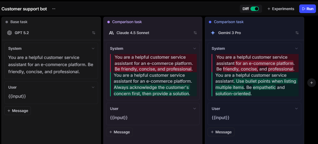 Once a developer identifies a problematic trace, Playground lets them load that trace's prompt and directly test modifications against real production data. The developer can adjust the prompt, swap the model, or change the system instructions, and Playground returns scored results side by side with the original output. Because the results appear immediately, the developer can iterate on a fix without writing a separate test script or leaving Braintrust.